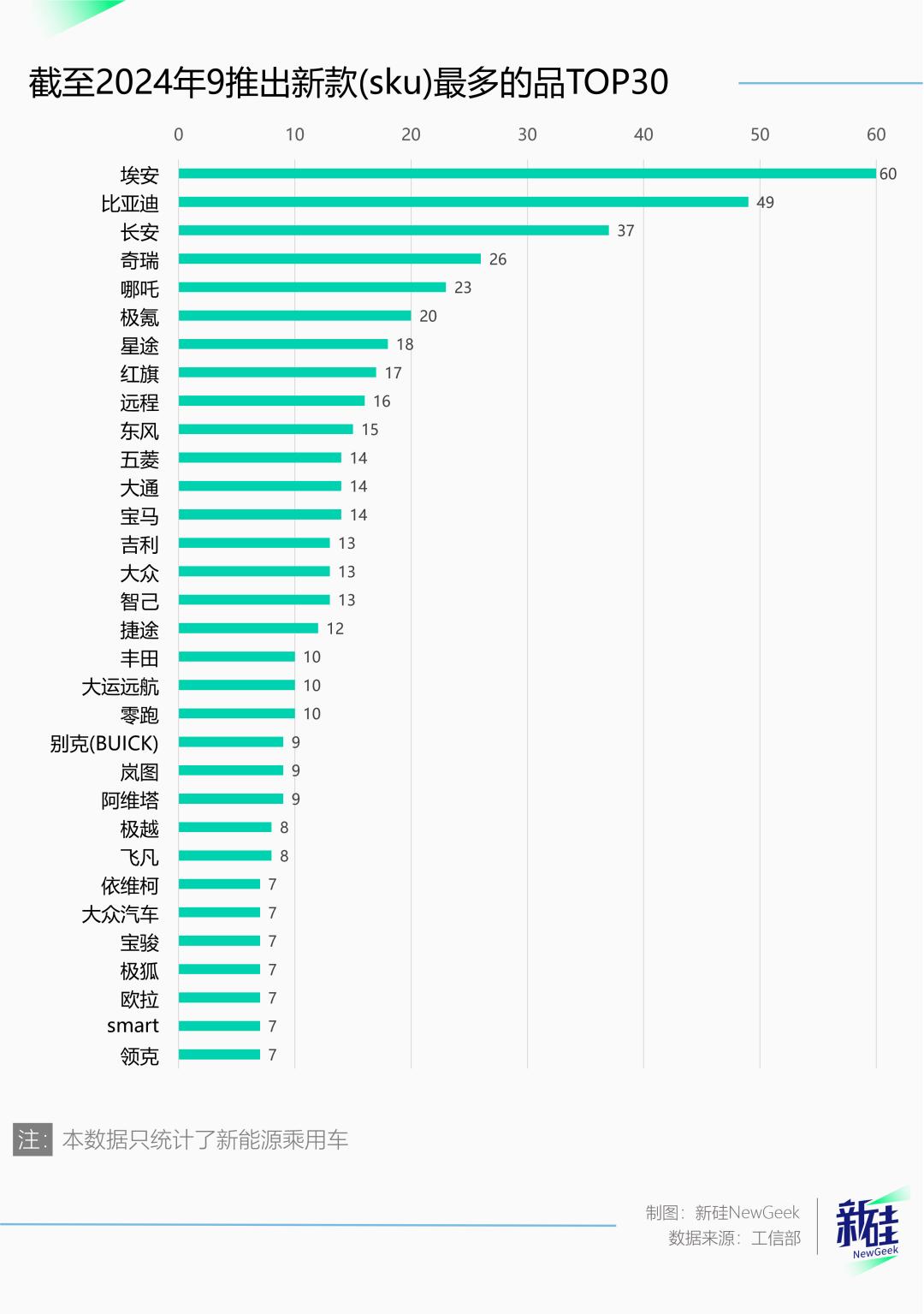 具体到车企品牌,截至今年9月,一共有94个品牌发布新款车型,平均一个品牌发布7款。其中埃安(AION)上新60款,排名第一,比亚迪、长安、奇瑞分别以49款、37款和26款,排名2-4位。