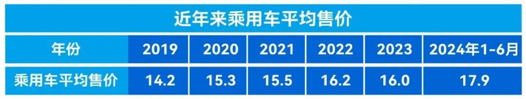 到了2024年,价格依然没有降低。乘联会数据显示,2019年,国内乘用车零售平均价格为14.2万元,2020年升至15.3万元,而今年上半年累计平均已达17.9万元,较2019年上涨3.7万元。