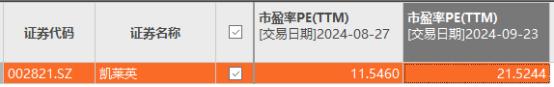 并且截至2024年9月23日,凯莱英市盈率(TTM)尽管有21.52倍,但主要是因为其2024年上半年业绩暴跌导致。在公布半年报前,凯莱英2024年8月27日市盈率(TTM)只有11.55倍。凯莱英2024年上半年营业收入为26.97亿元,同比下降41.63%;其归母净利润为4.99亿元,同比下降70.4%。对此,凯莱英在公告中表示,主要原因包括,去年同期交付的大订单毛利率较高;新兴业务收入下降,以及部分业务处于爬坡期,产能利用率相对较低,加上国内市场竞争较为激烈,导致新兴业务毛利率较低;尽管公司严格控制各项成本费用,但难以在短时间内实现与收入降幅保持同步调整。