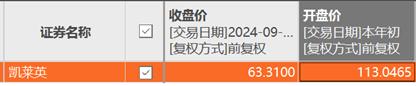 万点研究根据条件这些条件找到了公司A,即凯莱英。需要指出的是,凯莱英今年股价大跌。截至2024年9月23日,东方财富显示,凯莱英收盘价为63.31元/股,相较年初113.05元/股的开盘价跌去了44%。
