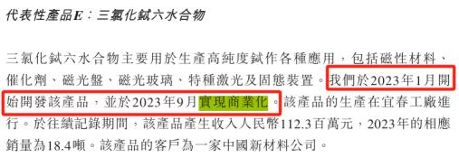 在此背景下,推动凌凯科技2023年收入增长的动力之一为三氯化铽六水合物。申报稿显示,凌凯科技2023年1月开始开发三氯化铽六水合物,并在2023年9月实现商业化。三氯化铽六水合物主要用于生产高纯度铽作各种应用,包括磁性材料、催化剂、磁光盘、磁光玻璃、特种激光及固态装置。
