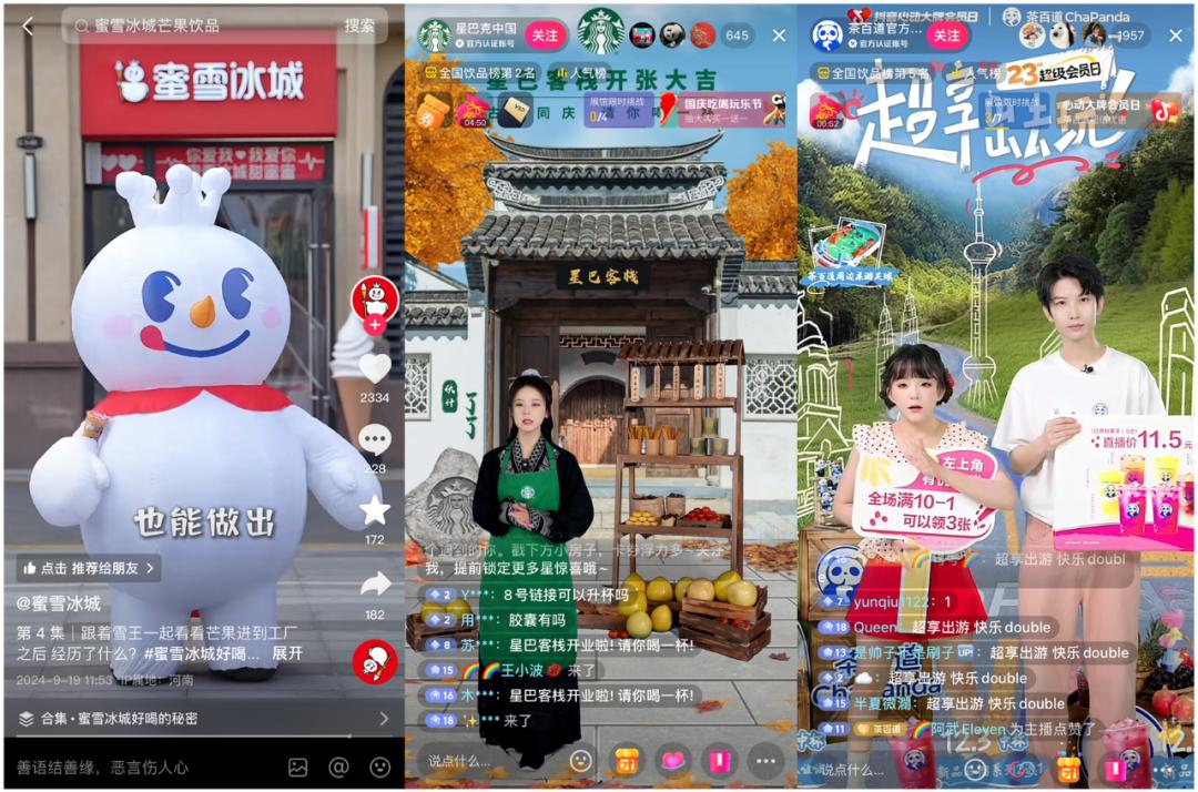 比如拿茶饮品牌来说,蜜雪冰城、星巴克、茶百道等在抖音就曾结合“秋天第一杯奶茶”的热点,左手依靠差异化的主题直播与短视频内容做营销,右手就利用「转赠」制造秋天第一杯奶茶的仪式感,据悉,蜜雪冰城单日转赠订单量就超过了10万单。