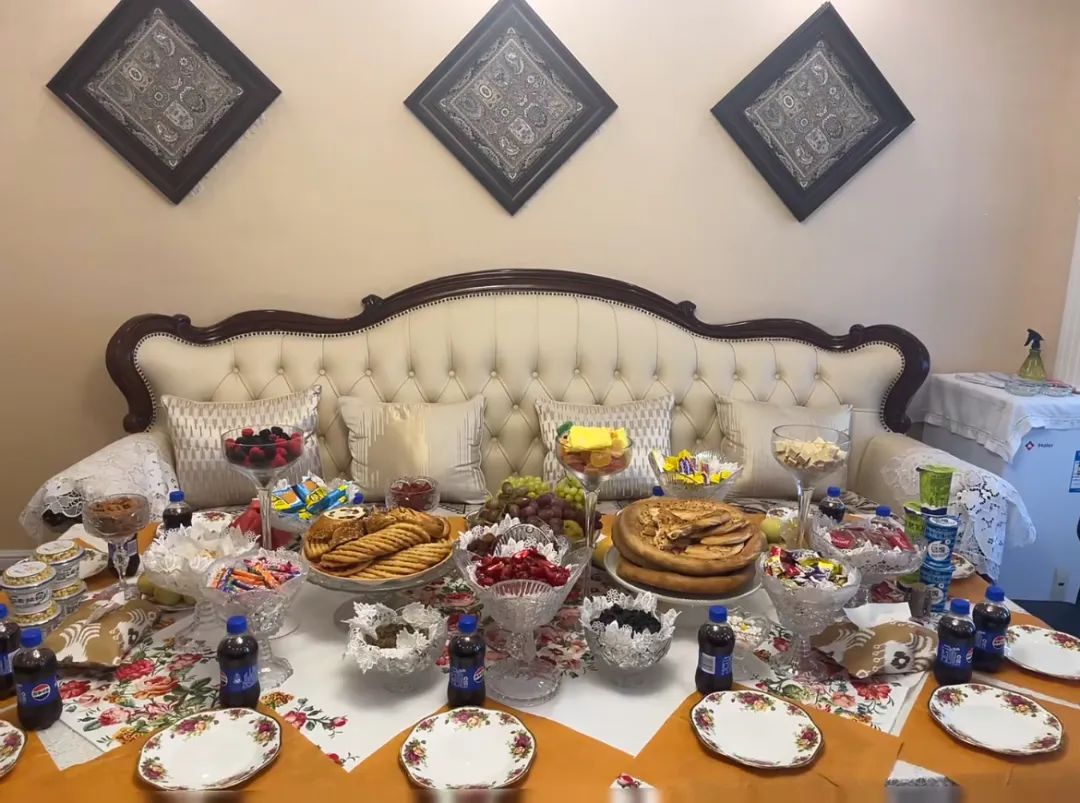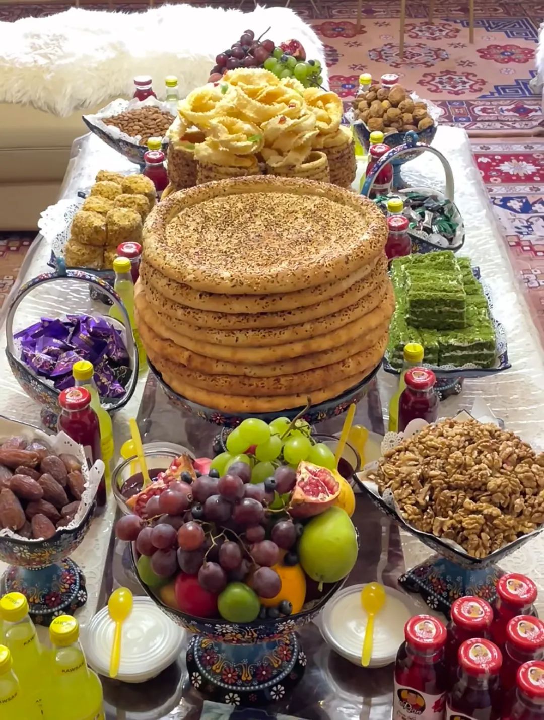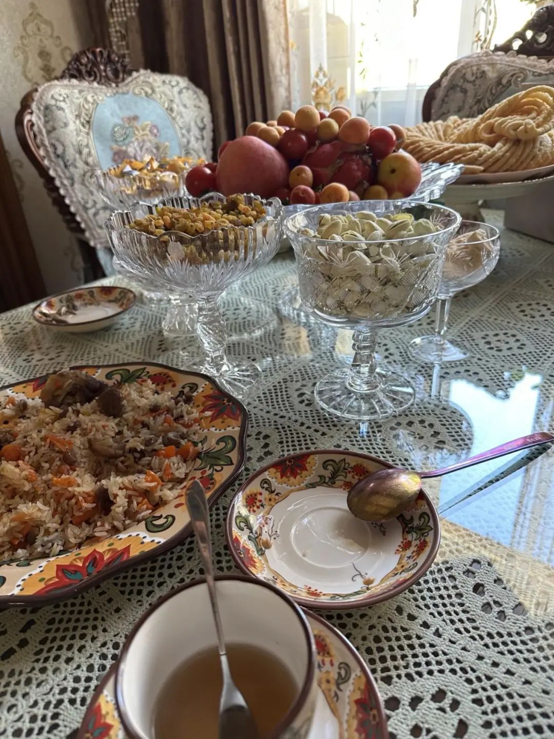 在空地上铺好妈妈寄来的地毯,客人到来之前,在茶几备上各色干果、美酒美食。