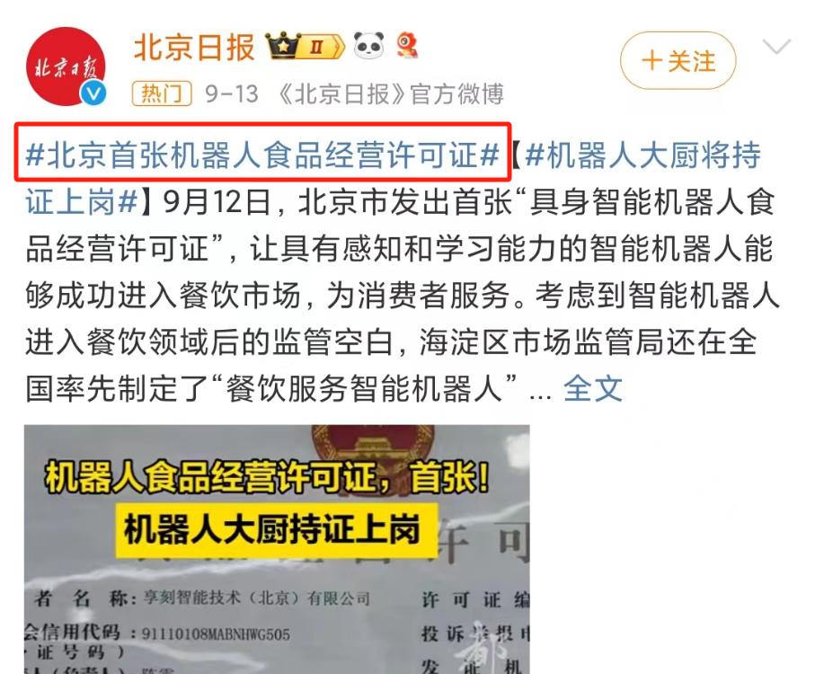 无独有偶,最近北京市发出首张“具身智能机器人食品经营许可证”,这动作背后相当于“AI 大厨”持证上岗了。