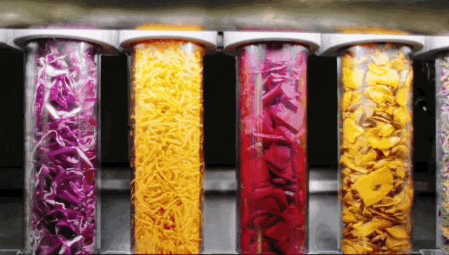 将五颜六色的食材放置在管道里,机器人控制好份量,碗在传送带上移动,最后搅拌和混合。