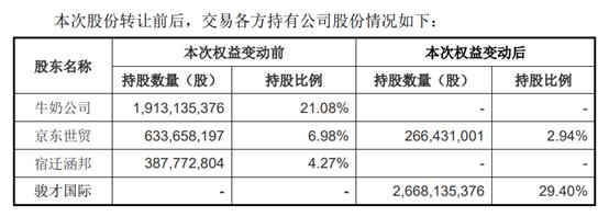 根据公告,骏才国际分别与牛奶公司、京东世贸、宿迁涵邦签订《股份购买协议》,随后三方将转让其所持有的永辉超市1,913,135,376股股份、367,227,196股股份和387,772,804股股份,分别占永辉超市总股本的21.08%、4.05%和4.27%。