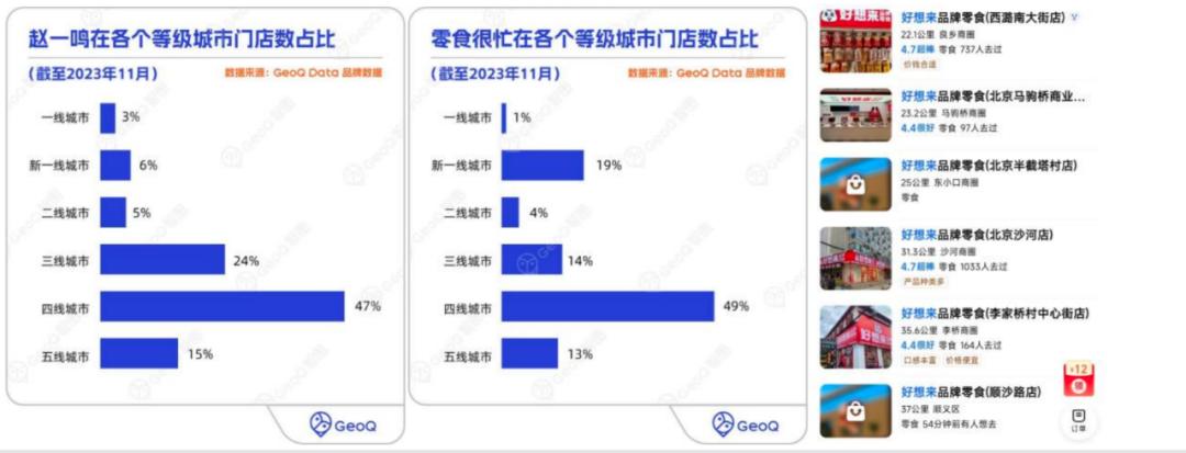 因此,在不同定位驱使下,赵一鸣们选择了差异化的市场打法。截至2023年11月,在赵一鸣零食和零食很忙的所有店铺中,来自四线城市的占比分别高达47%和49%,三线城市也占到24%和14%,也就是说大部分门店都开在了县城中;而在北上等一线城市,良品铺子、来伊份的“出镜率”很高,好想来在北京的布局还多是停留在各个郊区。