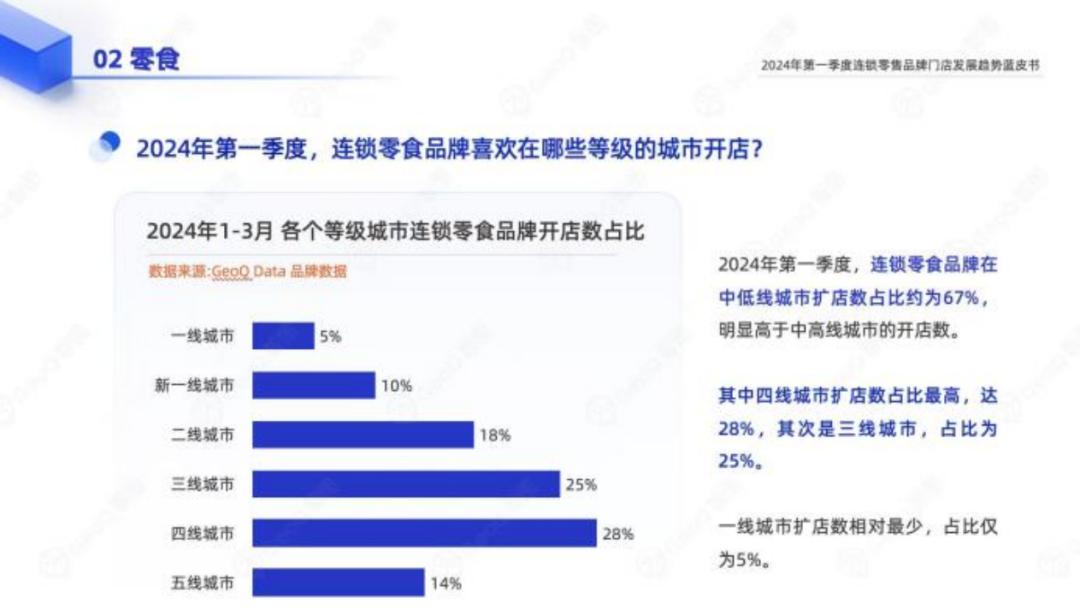 据GeoQ数据发布的《2024年第一季度连锁零售品牌门店发展趋势蓝皮书》披露,今年一季度,连锁零食品牌在中低线城市扩店数占比约为67%,明显高于中高线城市开店数,其中四线和三线扩店占比最高,一线则相对最少。