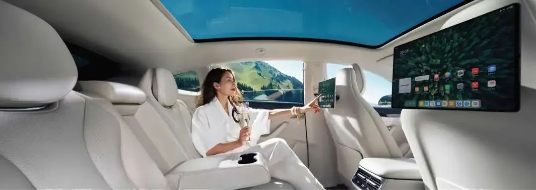 后排还配备了两个屏幕,前排又配备了一个悬浮式中控屏,这几个屏幕之间可以通过HUAWEI MagLink多端互联,让每个座位都实现大彩电。