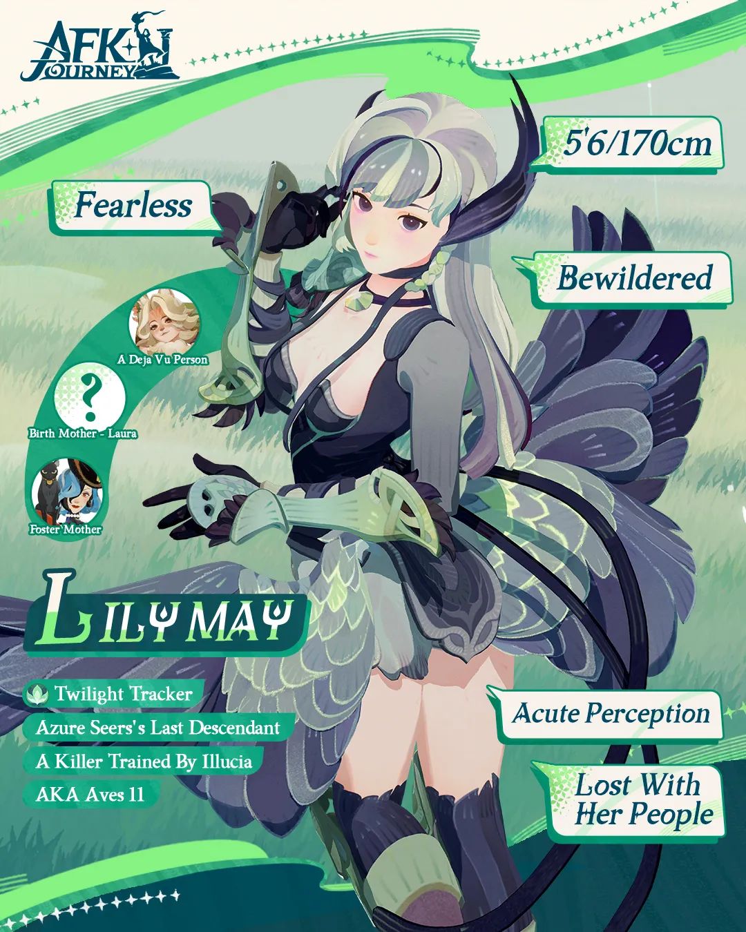 在设计上,莉莉·梅巧妙地融入了燕子的元素,最为显著的是其腰间自然延伸出的一对羽翼。在闭合状态下,其优雅的弧线既模拟了鸟儿休憩时收敛的双翼,又形似一条漂亮的燕尾裙,使得人物不失特色并保持美观。同时,人物采用的浅绿配色不仅与树林、树叶等意象相呼应,更加强调了莉莉·梅灵动、飘逸的气质。