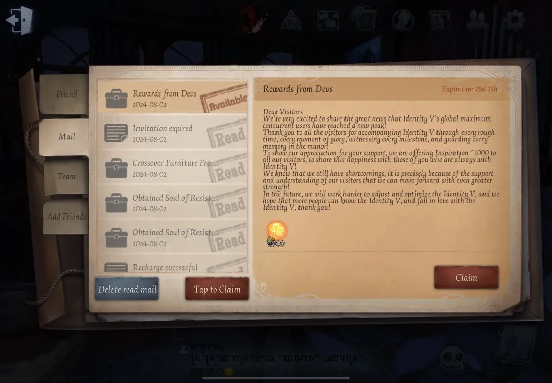 并且,官方在当天宣布,游戏全球同时在线人数创下新高,将送出1000灵感以答谢访客们的支持。