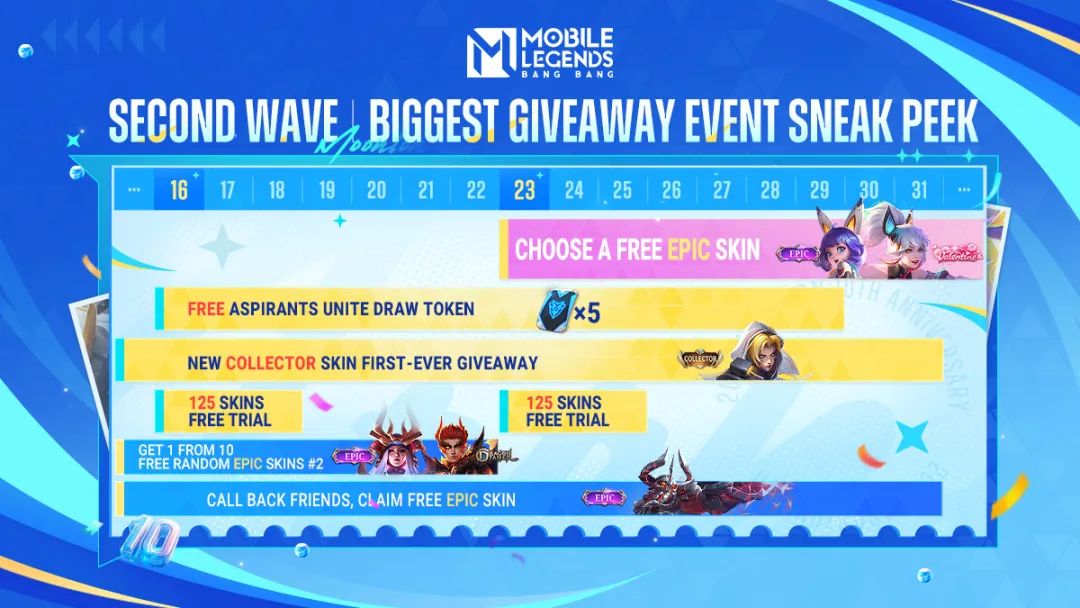 为庆祝沐瞳十周年,《MLBB》推出的福利再度加码,玩家参与相关活动即可免费获得史诗皮肤,自8月16日起,所有英雄和包括独家史诗皮肤在内的125款皮肤均可供玩家免费试用,多款限定皮肤限时返场。