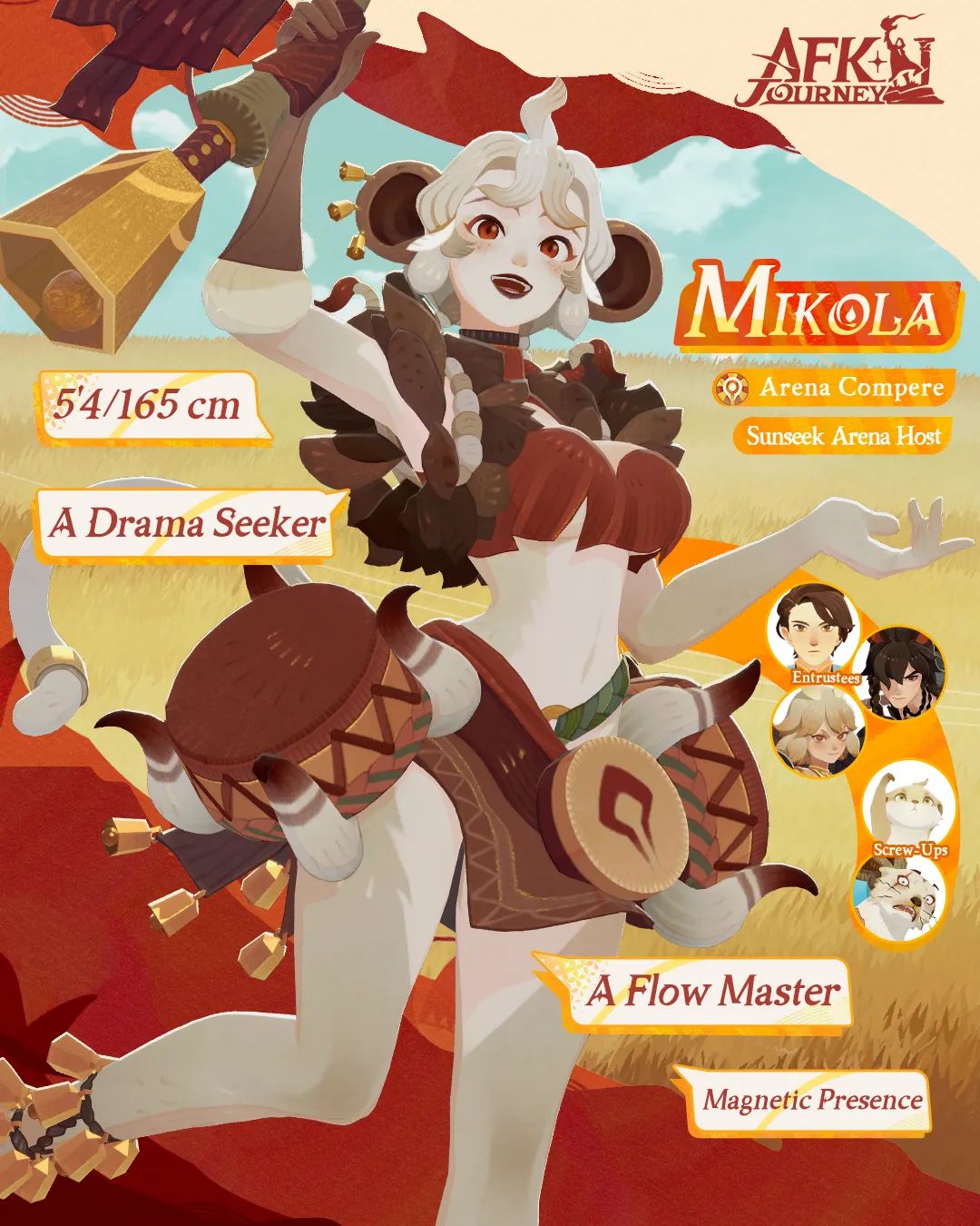 相比之下,后者的风格则截然不同。米科拉周身点缀着铃铛饰品,手中也紧握着一枚大型铃铛,与腰间悬挂的双鼓相得益彰,共同勾勒出独特的部落风情。其服饰以红棕色为主色调,不仅生动展现出其热情如火、充满活力的性格特征,也体现出她好战的内在气质。