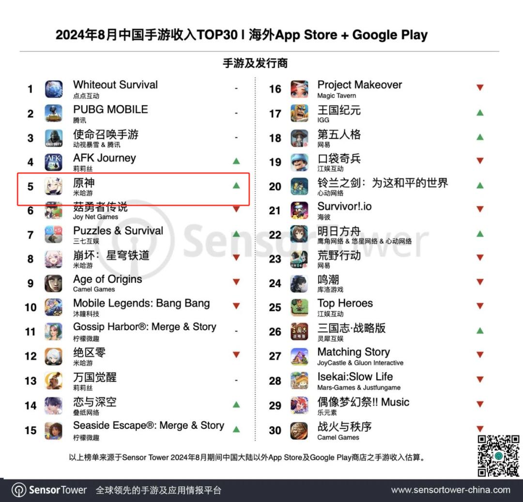 本期,《Whiteout Survival》(无尽冬日)海外收入环比增长14%,稳居出海手游收入榜冠军。《AFK Journey》(剑与远征:启程)8月海外收入激增418%,超越《原神》跃居收入榜第4名。