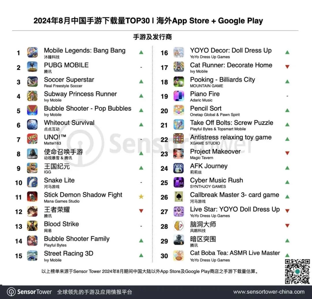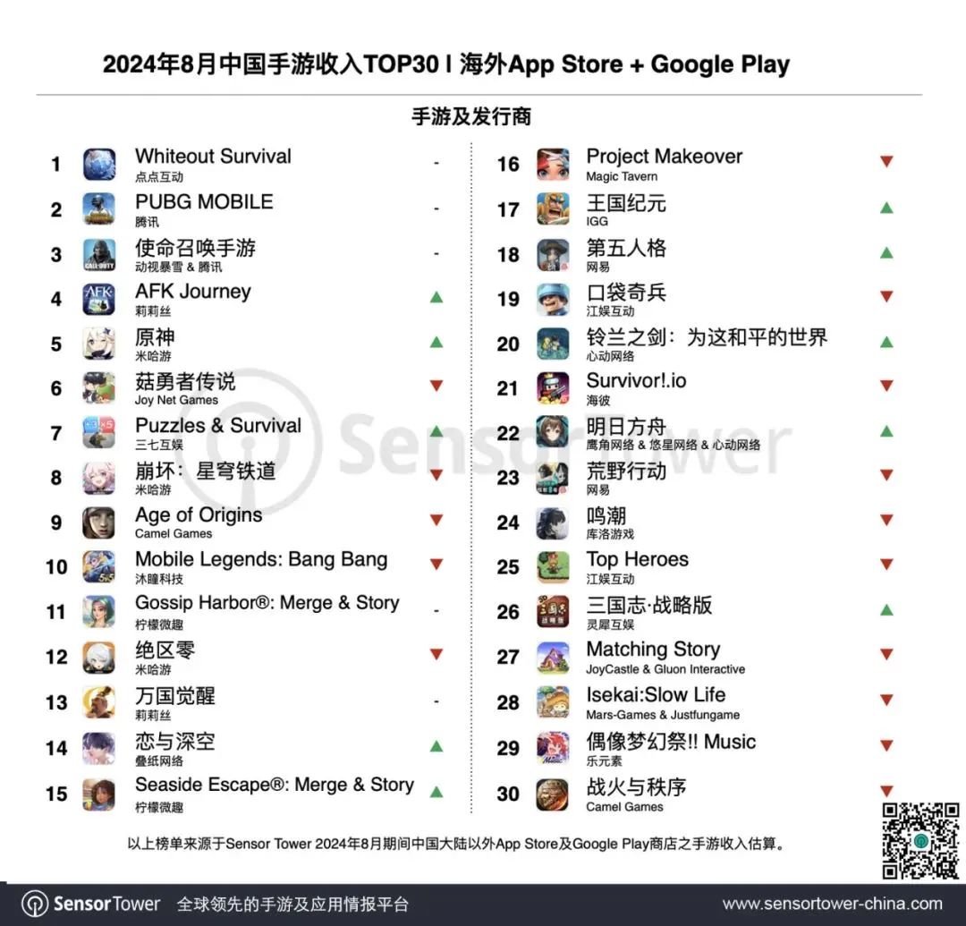 近日(9月19日),Sensor Tower发布了2024年8月中国手游产品在海外App Store和Google Play的收入排行Top30(本报告仅统计应⽤商店IAP预估值,不包括⼴告变现收⼊和中国地区第三方安卓渠道收入)。