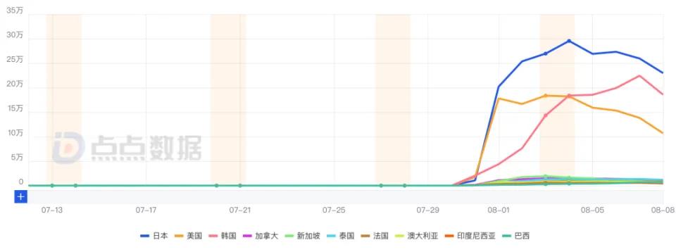 点点数据显示,该游戏在海外市场(不含港澳台版本)上线仅8天,双端预估总收入(扣除平台分成)约3857万元人民币。其中,日本、美国、韩国三个市场贡献了较多的付费,在T1市场呈多点开花的趋势。