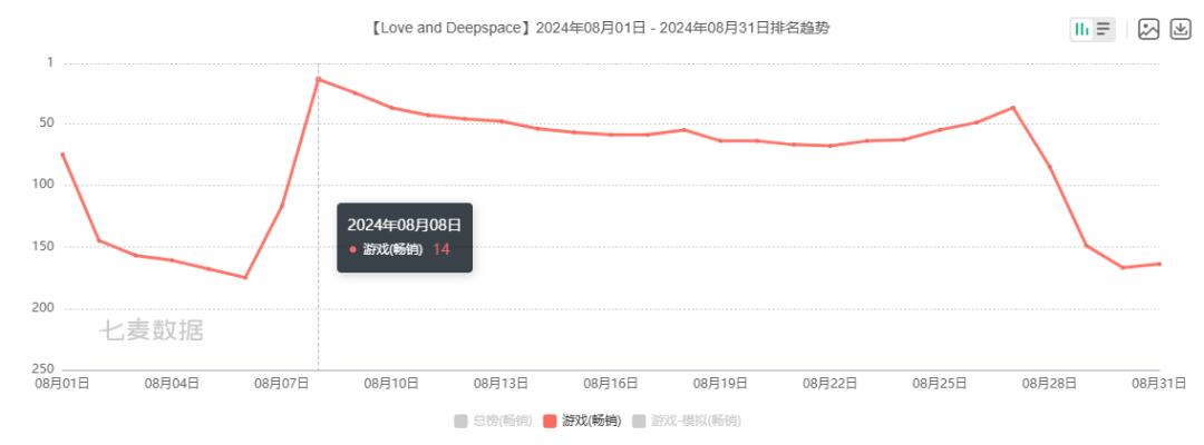 最后,叠纸的《恋与深空》自6月登上出海收入手游TOP30以来,游戏一直呈现出不俗的上升趋势。