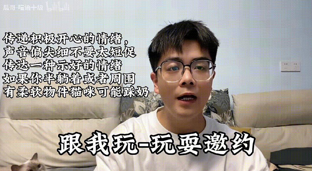 瓜哥在视频中教授了五句最常用的猫语,比如邀请猫咪来玩时,只要把普通话的“跟我玩”,用一种尖细短促的语气说出,让发出的声音介于“嗷呜”和“跟我玩”之间即可。