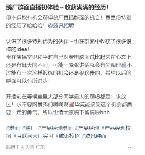 腾讯对这次“烽火戏诸猴”般的直播的定位是,帮助求职者打破壁垒,通过直播学习更多群面技巧。也不是没有人体会到腾讯的“用心良苦”,部分参与直播的求职者分享了自己的收获与体会,恳请大家“不要网暴”。