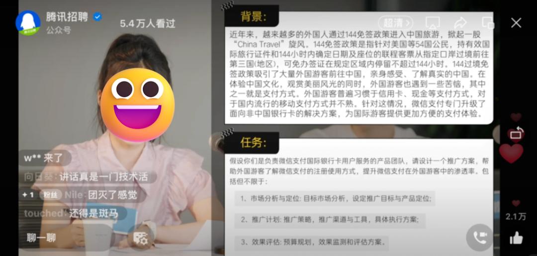 此次校招岗位为产品策划(To C方向),15名求职者被分为两组,进行群体面试。持续三个多小时的直播,腾讯还设计了弹幕互动的“小巧思”,让观众通过互动与投票,体验一把大厂HR大权在握的爽感。