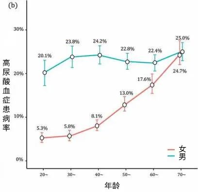 雌激素被认为是造成性别差异的主要原因。雌激素能影响肾脏的清除和重吸收等功能,其高低与尿酸水平呈现负相关。由于第二性征的发育、激素的不同,尿酸水平在青春期开始出现性别差异。这也是为何,成年男性尿酸普遍高于同龄女性,但绝经后女性人群与男性的差距逐渐缩小。