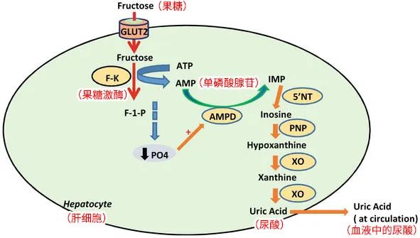 葡萄糖被吸收进入血液后,主要用于供能,多余的会以糖原的形式储存在肌肉、肝脏中,或进入脂肪细胞以备不时之需。果糖进入人体后,则会被运送到肝脏进行代谢。在肝脏中,分解果糖的酶开始工作,一系列复杂过程中会有一种叫做单磷酸腺苷(AMP)的物质形成,而它正是尿酸生成的底物。