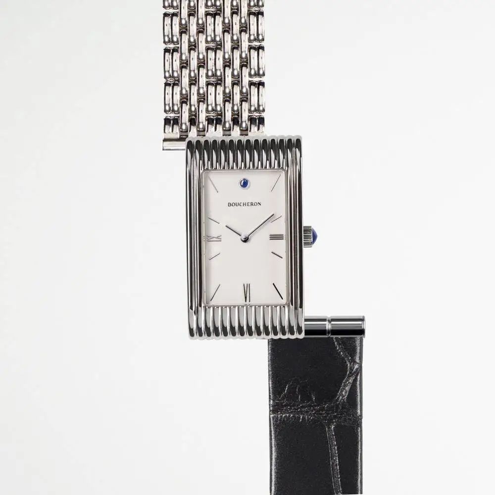宝诗龙 Reflet 系列上的隐藏横推式卡扣,和 Apple Watch 上的极为相似,当然你也可以把这种结构称为嵌入式。