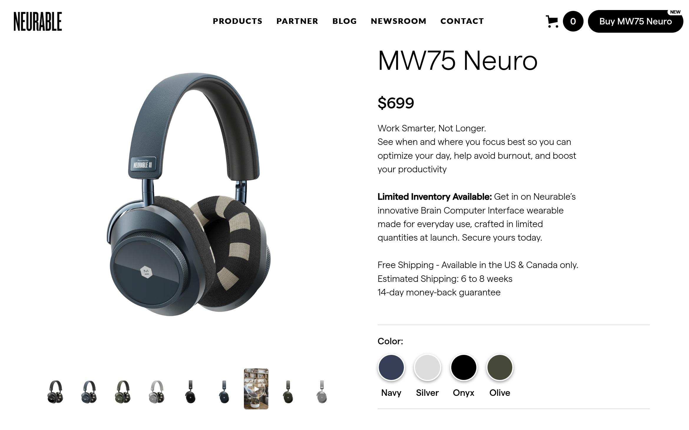 目前,MW75 Neuro 共有银色、玛瑙色、海军蓝和橄榄色 4 种颜色可选,已经开始接受订购。不过考虑到接近 5000 元(699 美元)的定价,绝大部分购买者肯定还是冲着 Neurable 的脑机接口。