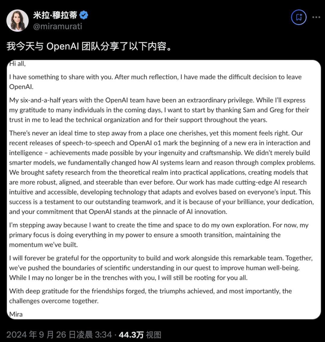 离开一个珍爱的地方从来没有一个理想的时间,但这一刻我感觉很正确。我们最近发布的实时语音交互和OpenAI o1模型标志着交互和智能新时代的开始,这些成就是由你们的智慧和工艺实现的。我们不仅建立了更智能的模型,而且从根本上改变了AI系统通过复杂问题学习和推理的方式。我们将安全研究从理论领域引入到实际应用中,创建了比以往任何时候都更加稳健、一致和可操纵的模型。我们的工作使尖端的AI研究变得直观和易于访问,开发基于每个人输入的适应和演变的技术。这一成功证明了我们杰出的团队合作,正是由于你们的才华、奉献和承诺,OpenAI才能站在AI创新的巅峰。