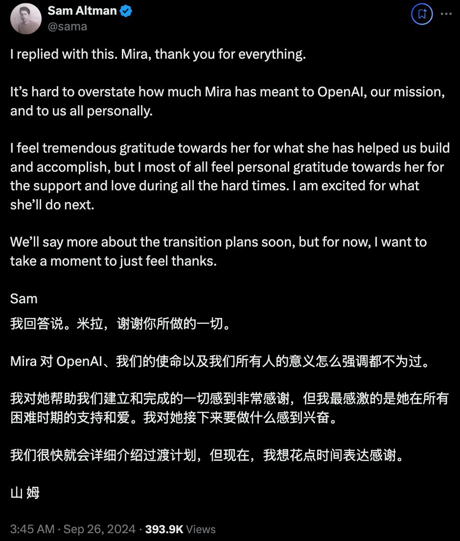 阿尔特曼已在社交平台上回应穆拉蒂的声明。他说感谢穆拉蒂所做的一切,OpenAI将很快会详细介绍过渡计划。