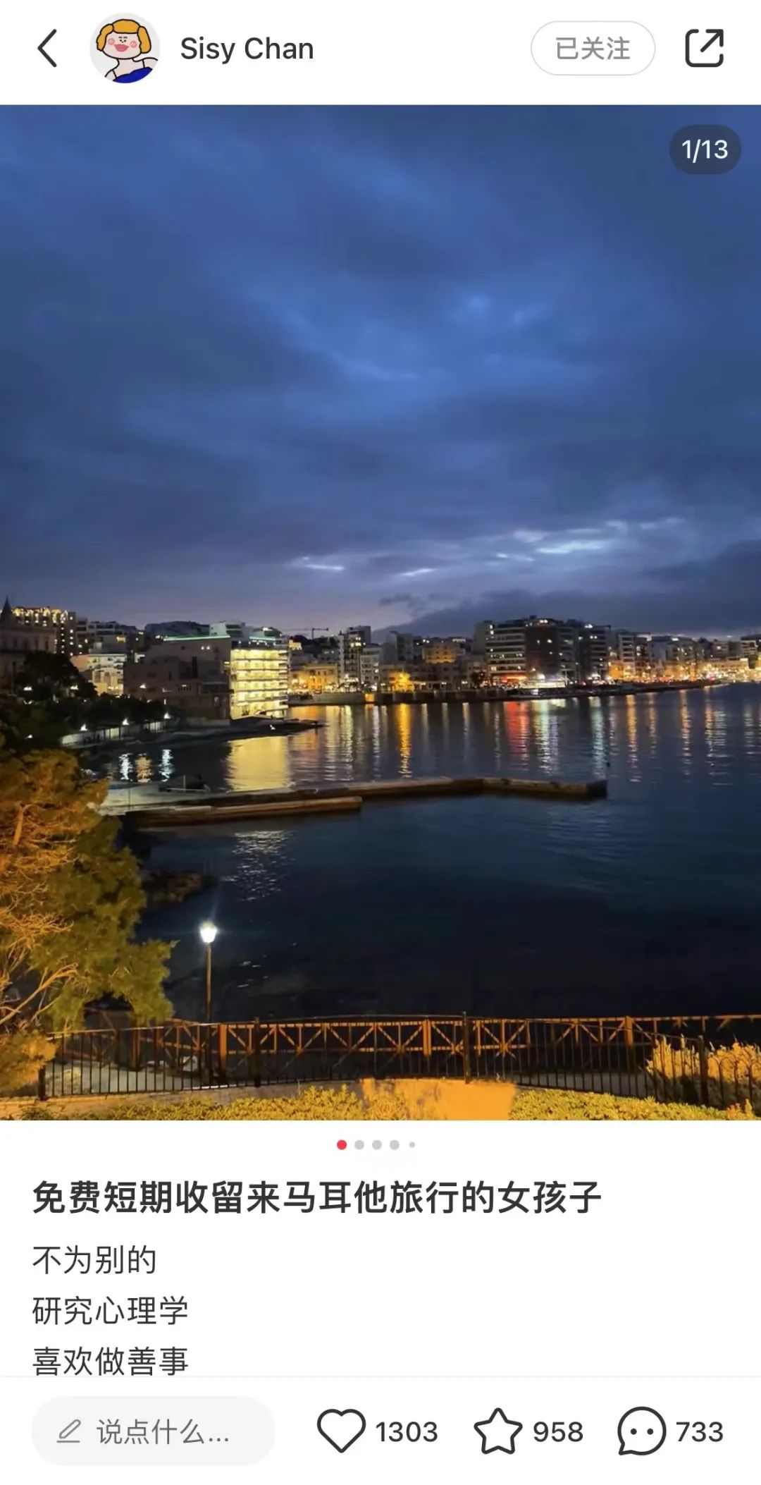 “免费短期收留来马耳他旅行的女孩子”,这是旅居马耳他的Sisy在社交媒体上发布的一则帖子的标题。