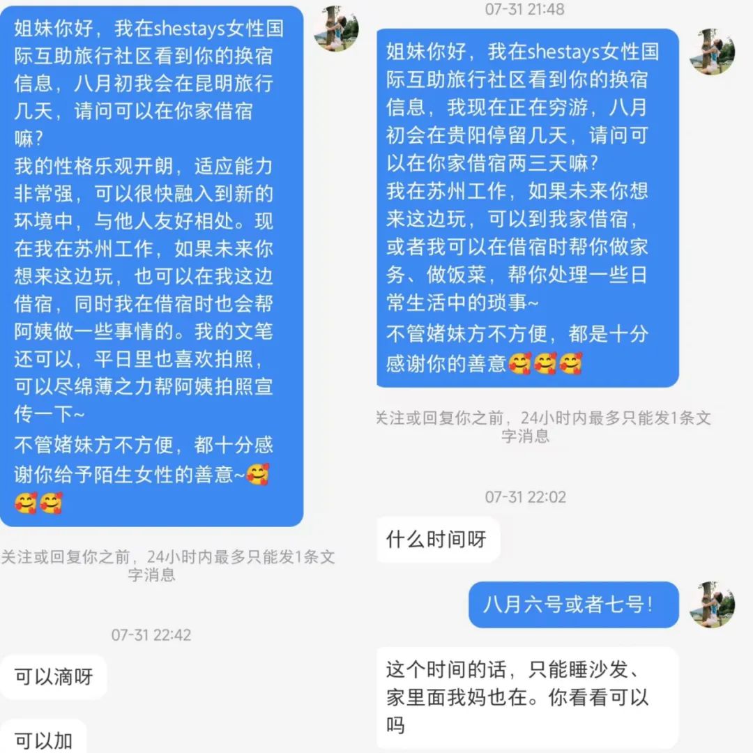 SheStays平台上也发生过并不愉快的借宿经历:住客和房主缺乏沟通,互相认为对方存在敌意,最终两人不欢而散——房客在社交平台上发出“避雷帖”,房主也万般委屈。虽然最后解除了误会,但也引起了围观者对女性借换宿“不靠谱”的讨论。