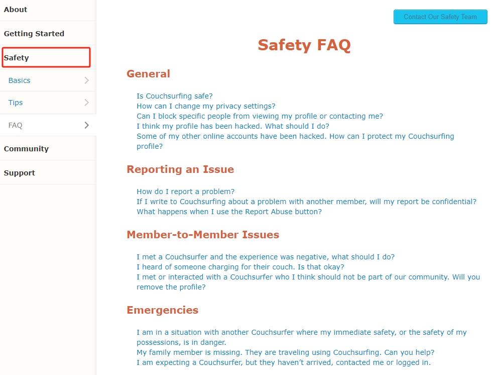 安全问题的解答在CouchSurfing的官网占了很大比重。(图/网页截图)