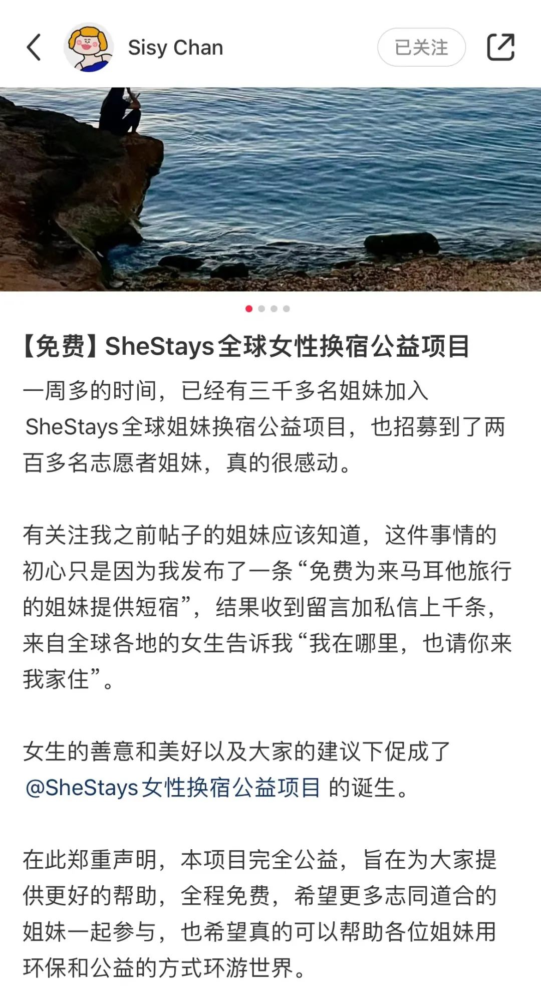 30天的时间内,Sisy自己的房间接待了20多位姐妹,对借换宿感兴趣的人已经挤满了近20个群。于是,Sisy迅速搭建起了初始团队,账号“SheStays女性国际互助旅行”(下文简称“SheStays”)正式创建。