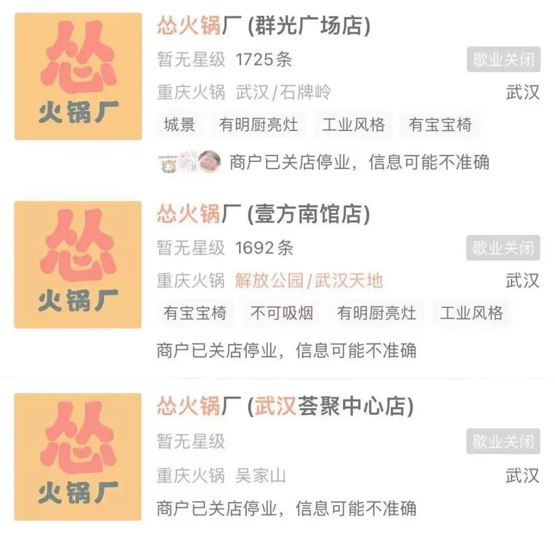 前不久,怂火锅宣布撤出武汉市场。在大众点评可以看到,目前包括怂火锅的武汉群光广场店、壹方南馆店、武汉荟聚中心店都显示“歇业关闭”。