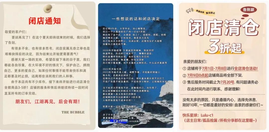 拥有50多万粉丝的8年老店"沉入深蓝 LOSVLUE"宣布闭店;与此同时,40多万粉丝的女装店"The Bubble"也发布了闭店通知,表示将开始清仓;"苏菜萝卜Studio"、"复古大爆炸"等都宣布闭店或停止上新;今年5月,拥有500多万粉丝的"5金冠"店铺"少女凯拉",被曝出拖欠200多家商家的货款,总金额超过3000万元。