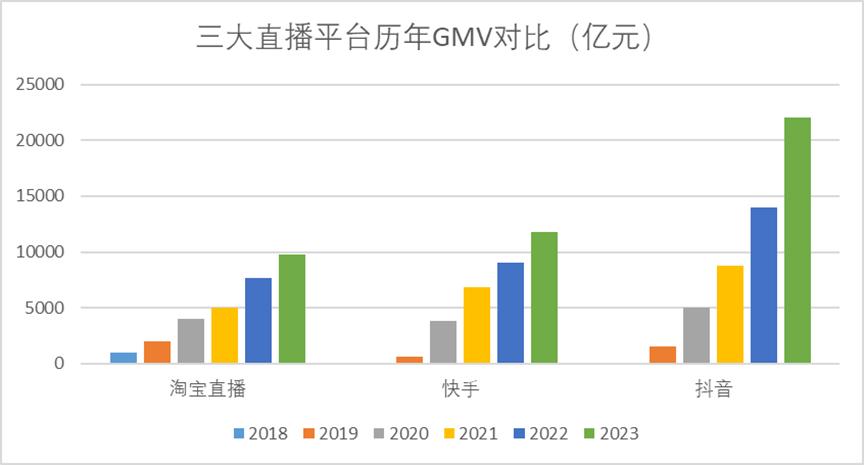 从2018年就开始运营的淘宝直播,直到2023年GMV仍未达万亿,不及抖音直播的一半,甚至被快手落下了一个身位。