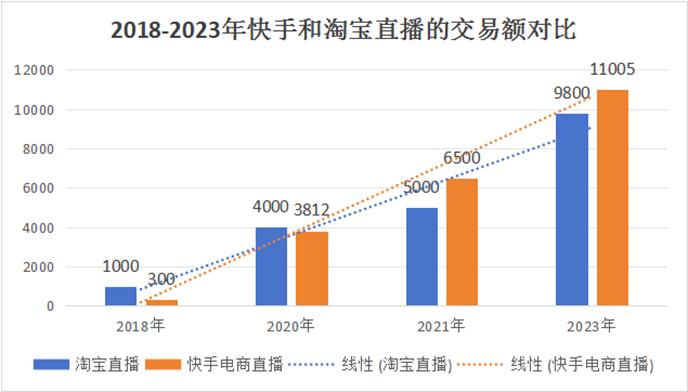 根据电数宝的数据,到了去年,快手全年交易额达到了11005亿人民币;同据电数宝电商大数据库显示,估计淘宝直播2023年GMV约为9800亿元。