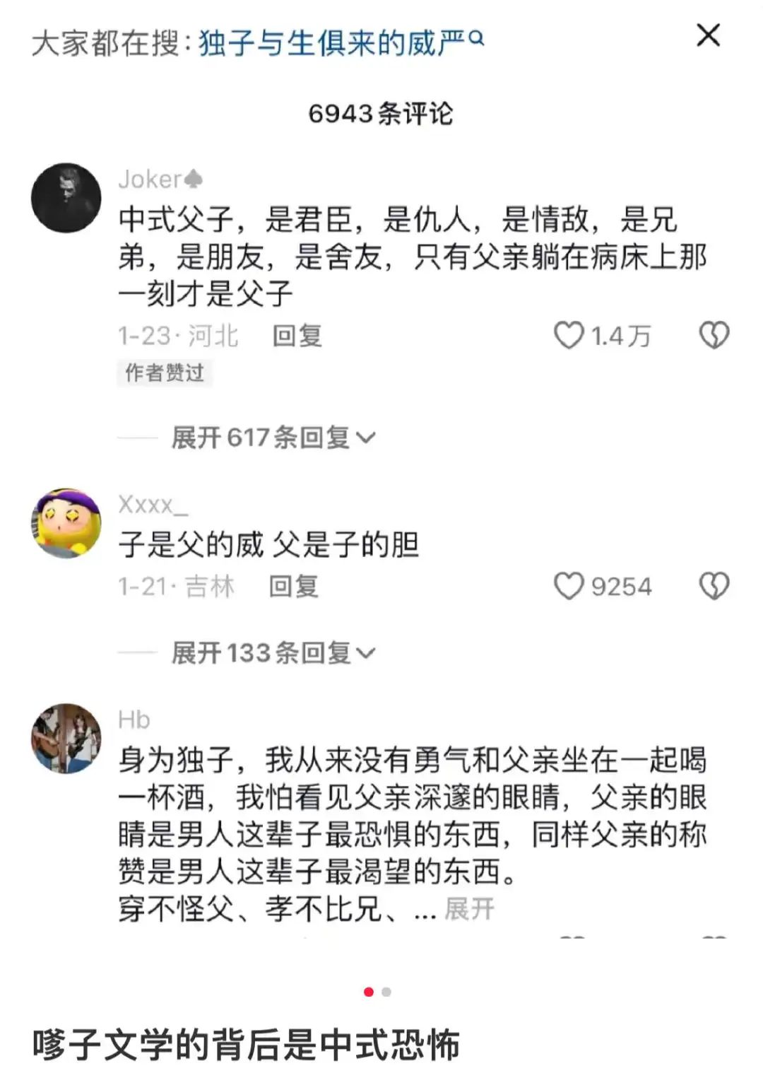 陈陈:这和娇妻文学也很像,经典就是“中式父子关系是君臣,是父子,只有到最后一刻他躺在病床上的时候才有可能是父亲和儿子” 的这种对父亲的崇拜和迷恋,还有一种是“虽然两室一厅,但是九龙夺嫡。”