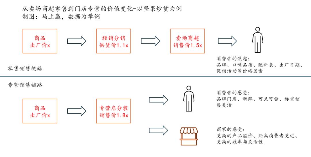 以近年来在零食量贩、坚果炒货铺子中占有相当大份额的坚果炒货类目来说,除了少数产品在门店现炒现制外,大多数产品依然需要依赖工厂的标准化生产,区别就是从包装变成了分装,从超市卖场变成了专营专卖门店,但最后消费者、商家的获得均得到了改善。
