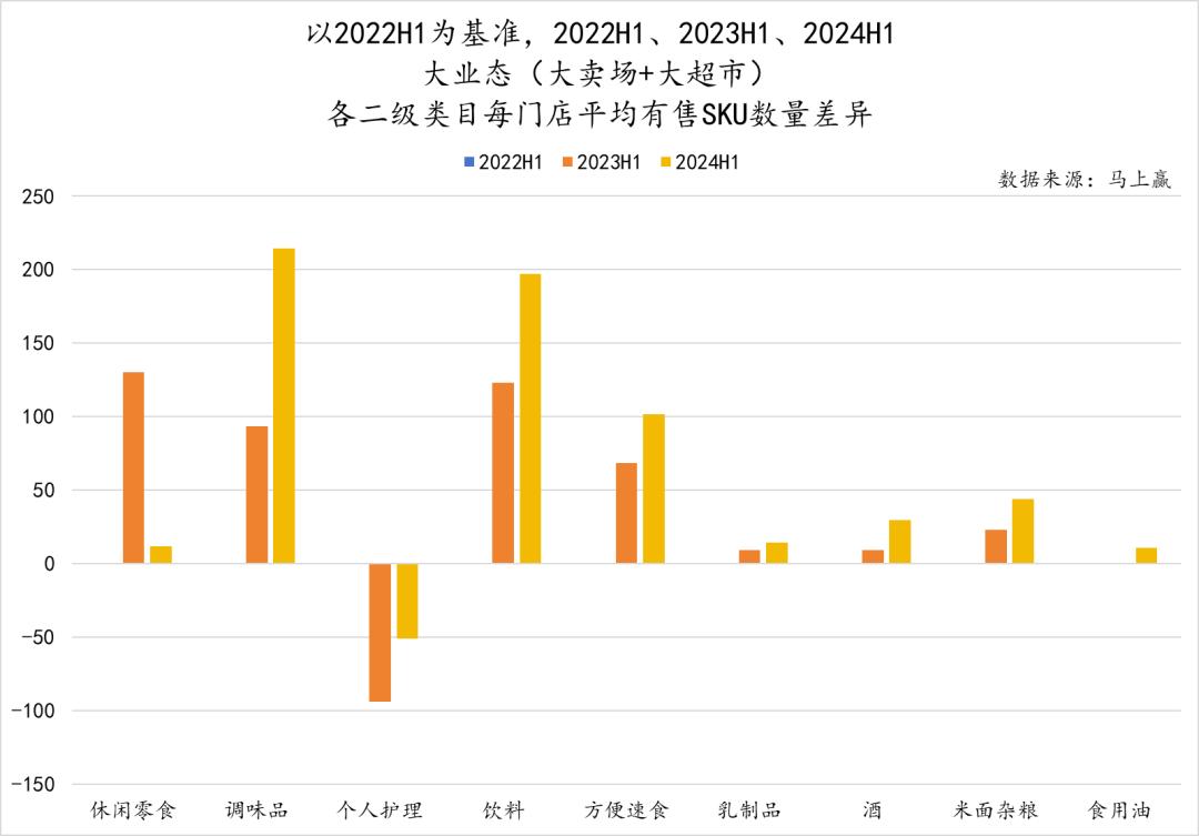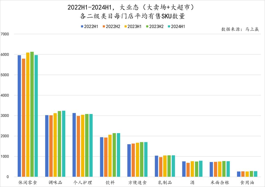 纵向同比来看,不同品类的SKU变化则更能代表其发展状况。休闲零食作为占据店均有售SKU数量大头的类目,同比来看数量也并未有减少的趋势,只是其增长的态势不如调味品、饮料以及方便速食显著。而个人护理类目下店均有售SKU数量同样不在少数,但其走势与前面几个类目不同,2023年H1、2024年H1相较于2022年H1均有所下跌。