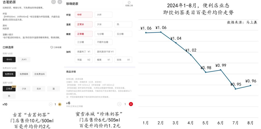 这一价格水平已经具备贴近甚至超越传统瓶装即饮奶茶的价格优势,基于马上赢品牌CT中的数据,同样以门店覆盖较广泛的便利店业态中的即饮奶茶为例,今年1-8月,即饮奶茶类目在便利店渠道的百毫升均价虽然从1月的1.06元/百毫升一路下探至7月的最低点0.95元/百毫升,但相比起促销活动频繁的门店现制奶茶,百毫升均价差仅有约20%。