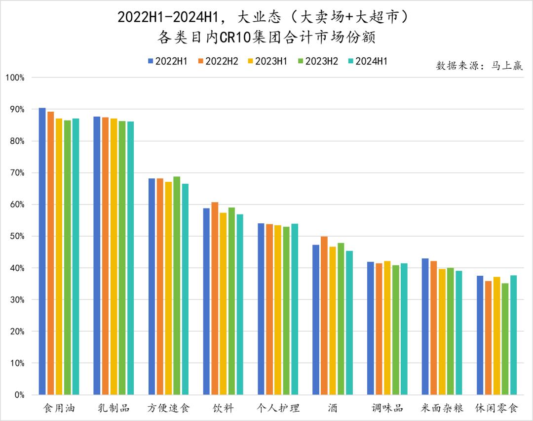 基于CR10合计市场份额情况来观察各类目下的品牌集中度,可以发现前文中包含合计集团数量更少的类目下品牌集中度相对更高,食用油、乳制品类目内CR10的市场份额合计均逼近90%,饮料类目内CR10市场份额总和也在60%左右。然而,作为在售SKU数、包含的合计集团数均相对较多的类目,方便速食赛道中CR10所占据的市场份额竟也高达70%左右,可见头部企业的话语权虽大,但也仍有较多玩家正向其发起攻势。