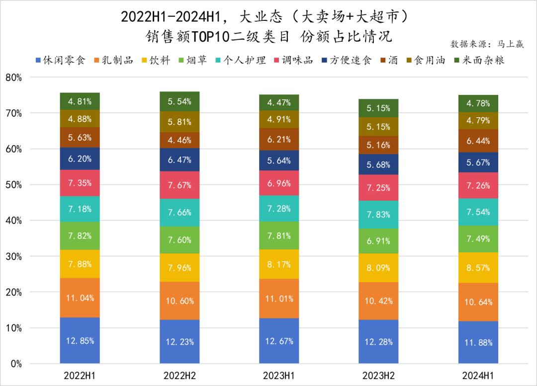 进一步观察销售额内的类目构成,马上赢梳理出了大业态下销售额TOP 10二级类目自2022年H1至2024年H1所占份额及其变化情况。可以看到,休闲零食的份额虽在2024年H1有明显的下降,但仍凭借11.88%稳居第一,紧随其后的乳制品同样也暂时不受威胁。排至第三的饮料类目与前二者不同,其市场份额在过去两年中几乎可以说是稳步提升,2024H1占比8.57%。