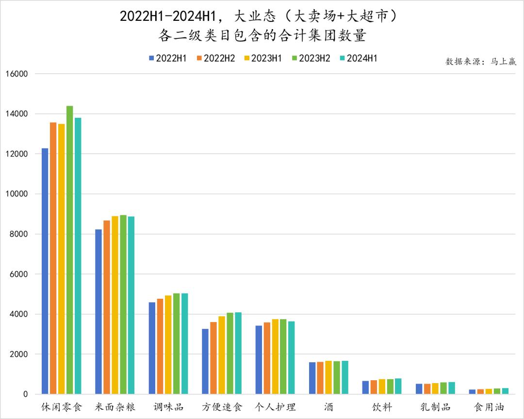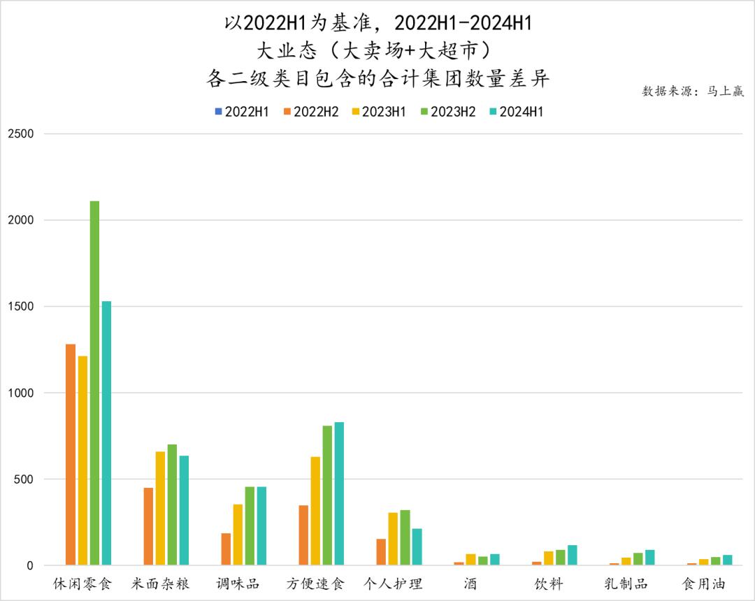 纵向来看类目内部的变化情况,不难看出各类目下合计集团数量对比2022年H1均是有增无减。其中,合计集团数量最多的休闲零食类目内,新增集团数也最多,2023年H2甚至在短短半年内新增了超过2000个集团。方便速食赛道内新增的竞争者也并不算少,最近一年的增势甚至超过了合计集团数量更多的米面杂粮和调味品,值得关注。