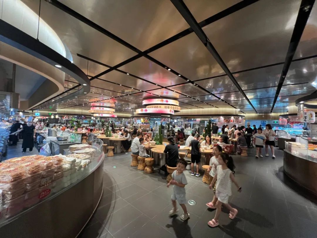 我们探访的易合仓超市位于一个中型的城市购物广场。这家店最大的特点是其经营面积中,绝大多数被超市自营的美食档口占据。档口类型既包括主食面点类的简餐,也包括现制小炒,甚至还有超市生鲜区肉类、海鲜类等的现场加工,类似盒马早些年门店的餐饮加强版。