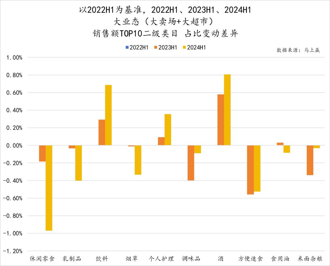 更直观地以2022H1为基准看TOP类目的份额变化情况。TOP 3类目中,休闲零食与乳制品在2023年H1、2024年H1的销售额同比2022年H1均有不同程度的下滑,仅有饮料类目同比情况逐年向好、攻势愈烈。在其余七个二级类目中,也仅有个人护理、酒两大类目的同比情况较为乐观,方便速食的市场份额更是在后两个观测周期内均有较为明显的下跌,程度仅次于休闲零食。