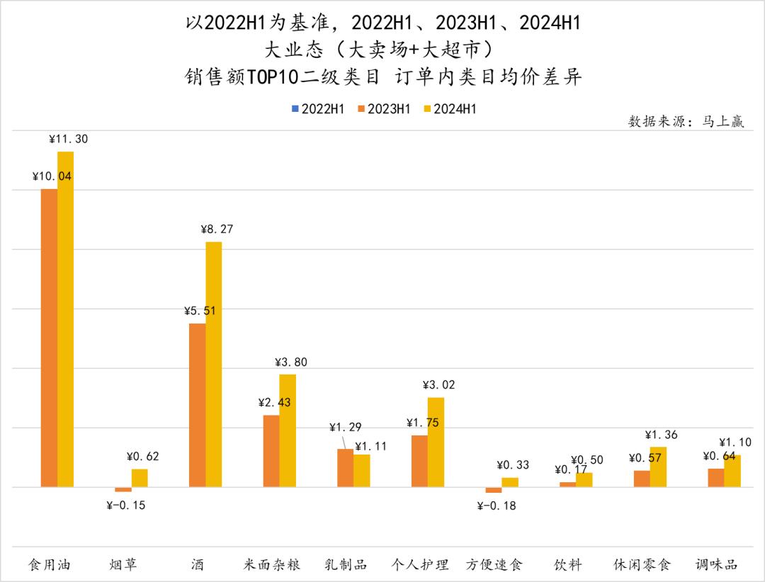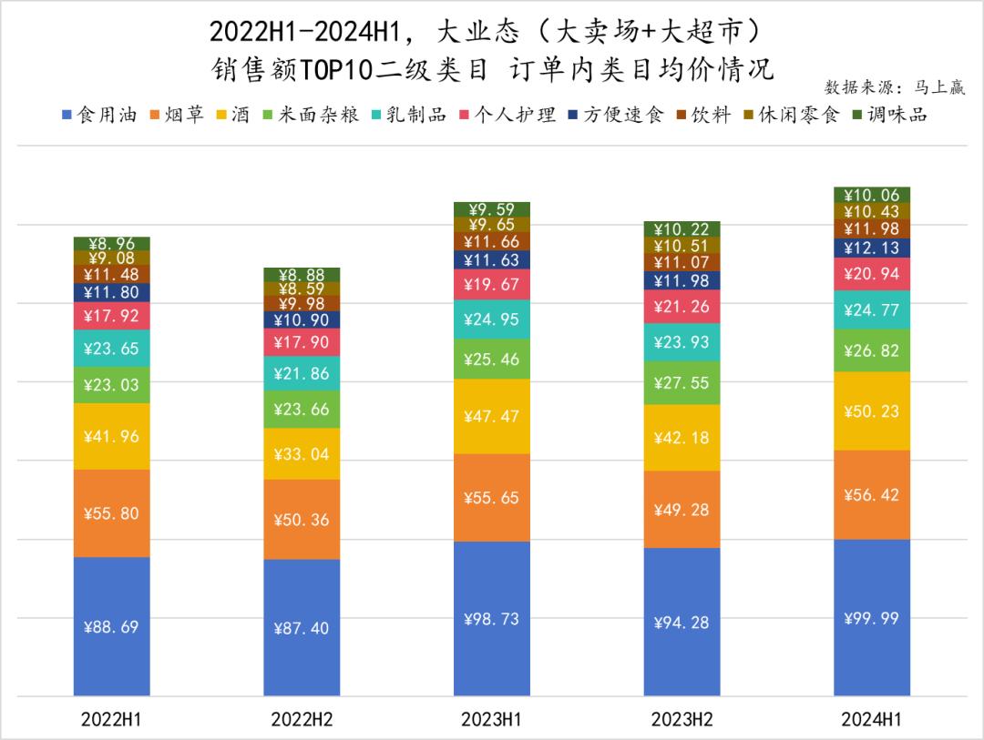 从类目均价情况切入,首先可以关注到销售额TOP 10二级类目整体均价走势有两个特征,一是周期性变化较为明显,食用油、烟草、酒等类目在H1的价格均明显高出H2;二是排除周期性波动来看,类目均价有一定幅度的提升。