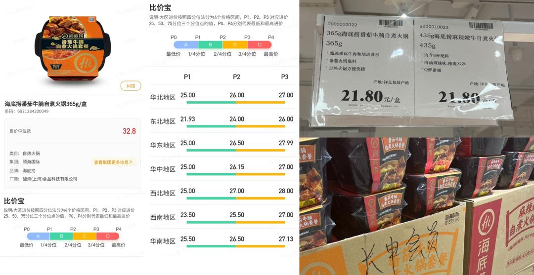 以在店内单独做地堆陈列的海底捞番茄牛肉自煮火锅365g为例,其会员制销售价格为21.8元/件。以该销售价与马上赢比价宝中的各区域商品进价进行对比,可以看到该售价不但低于各渠道的销售均价,甚至比很多区域平均水平以上的商品进价还要便宜。