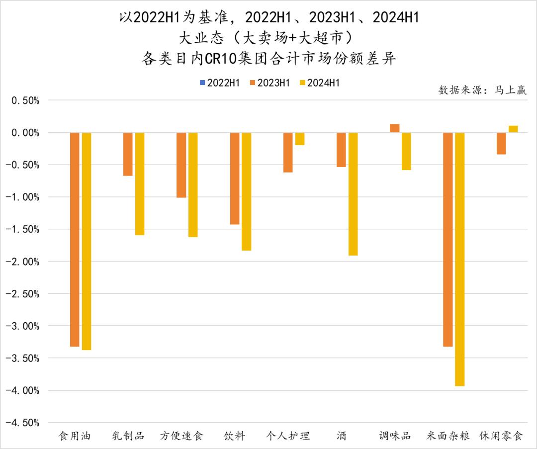 上文的卖场超市数据中,我们曾经提到,卖场超市的类目份额占比中,休闲零食、方便速食、乳制品几个类目的份额均有较明显的同比跌幅,尤其是在2024H1的,其份额的跌幅显著扩大,远大于大盘的平均跌幅。